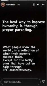 Taking to her Instagram story, Wofaifada stated that good parenting is important to improve humanity as people tend to show the world the exact reflection of what their parents showed them.