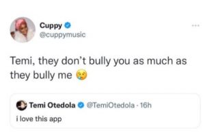 Then her sister, DJ Cuppy responded to the tweet, stating that Temi is not being bullied as much as she (Cuppy)is being bullied on the platform.