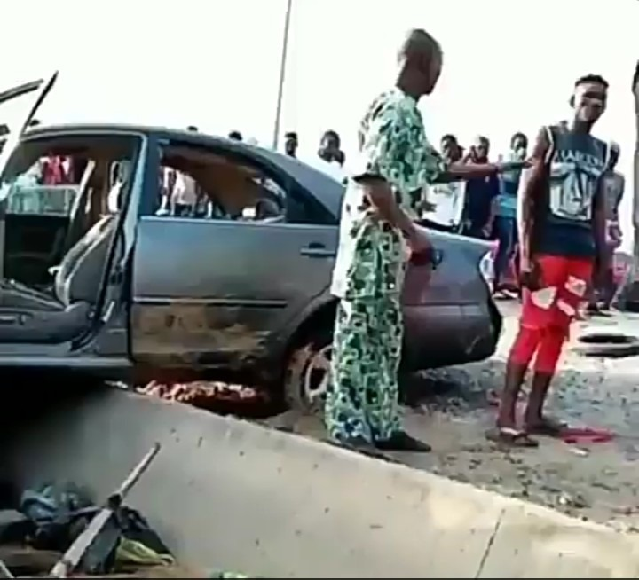 A video from the scene of the carnage shows blood splattered on the road and a mangled car hanging on a gutter where it ended up following the accident.