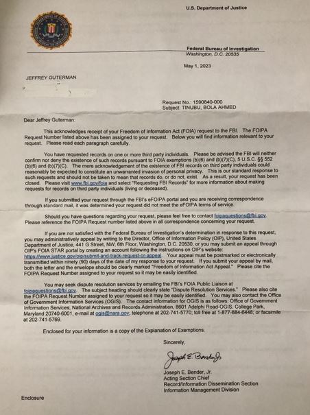 He wrote, “See below a copy of the letter I received today from the @FBI regarding my request, based on the Freedom of Information Act, for the FBI file on Bola Tinubu.
