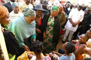 The chairperson of the women’s campaign team had on her entourage the wife of the APC vice presidential candidate Hajiya Nana Shettima, the wife of the Minister of State, Petroleum, Mrs. Alanyingi Sylva, and the national coordinator of the women’s campaign team, Dr. Asabe Vlita Bashir. They were received and conducted around the IDP camps by the Minister of  State for Petroleum, Dr. Timipre Sylva.