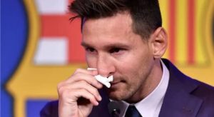 At the farewell conference to Barcelona, Messi shed tears which led to his wife, Antonella handing him a tissue.