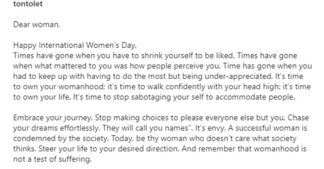 “Dear woman, Happy International Women’s Day, Times have gone when you have to shrink yourself to be liked. Times have gone when what mattered to you was how people perceive you. Time has gone when you had to keep up with having to do the most but being under-appreciated.
