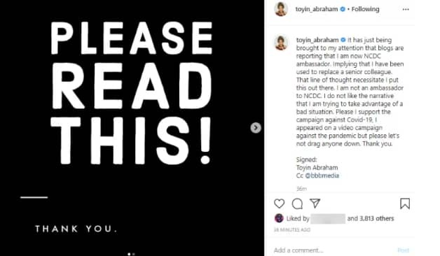 ” It has just being brought to my attention that blogs are reporting that I am now NCDC ambassador. Implying that I have been used to replace a senior colleague. That line of thought necessitate I put this out there. I am not an ambassador to NCDC. I do not like the narrative that I am trying to take advantage of a bad situation. Please I support the campaign against Covid-19, I appeared on a video campaign against the pandemic but please let’s not drag anyone down. Thank you.