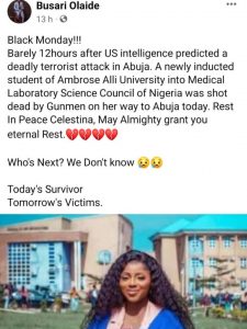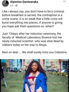 13 days after her induction into the Medical Laboratory Council of Nigeria, Celestina was traveling back to Abuja, where she resides, when she was shot dead by yet-to-be-identified gunmen.