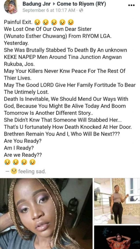 A woman was stabbed to death, allegedly by a Keke NAPEP driver, one week after she took to Facebook to celebrate her birthday.