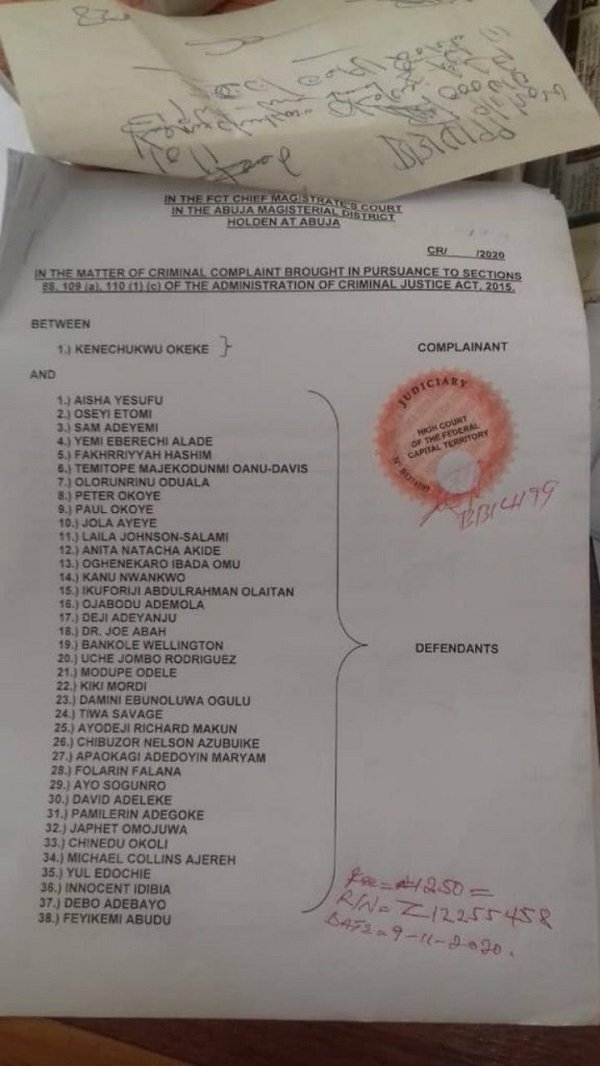 The defendants include; Aisha Yesufu, Oseyi Etomi, Sam Adeyemi, Yemi Alade, Rinu Oduala, Peter Okoye, Paul Okoye, Kanu Nwankwo, Deji Adeyanju, Dr. Joe Abah, Banky W, Kiki Mordi, Modupe Odele, Burna Boy.