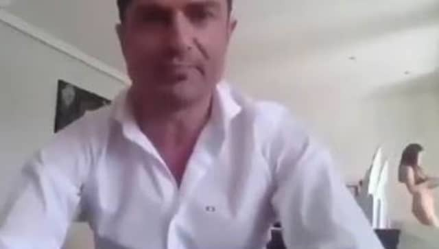 Merlos, 41, was presenting a report on the Estado de Alarma channel from his home when a woman, appearing to only be wearing a bra, walked through the room, in view of the camera.