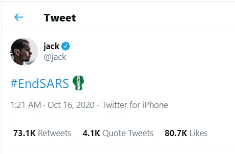 Twitter CEO, Jack Dorsey has revealed special #EndSARS Emoji after endorsing the movement against police brutality and other unlawful crimes in Nigeria.