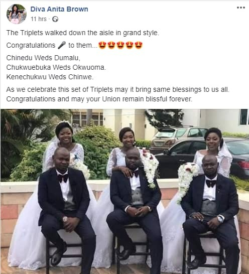 The triplets who walked down the aisle on Saturday, June 6 got married in this order; Chinedu Weds Dumalu, Chukwuebuka Weds Okwuoma, Kenechukwu Weds Chinwe.