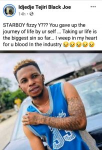 A Warri-based upcoming artiste identified as Starboy Fizzy has committed suicide by drinking a poisonous substance suspected to be Snipper.