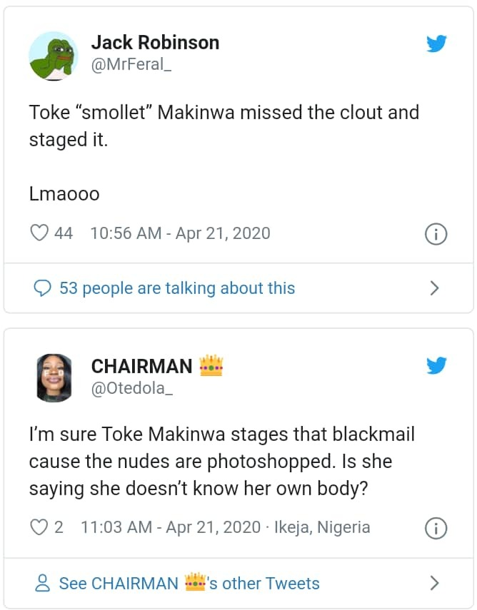 UPDATE: Nigerians Accuse Toke Makinwa Of Staging Nude Photo Blackmail To Trend