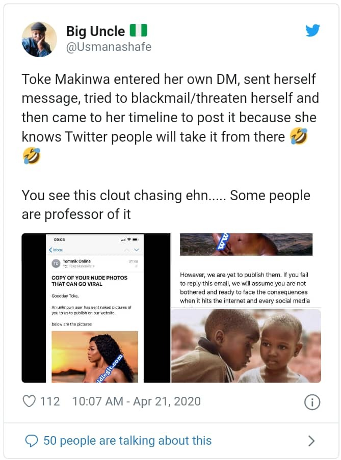 Earlier today, Toke Makinwa exposed a fraudster who tried to blackmail her with her ‘nudes’, though Nigerians on social media believe it was all staged.
