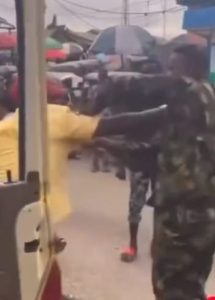 In a video that has gone viral, soldiers numbering eight with makeshift masks on their faces, got hold of the LASTMA officer and beat him for several minutes. One of the irate soldiers was seen battering the officer to the ground as other LASTMA officers fled the scene.