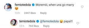 She shared a photo of both of them on her Instagram page and the billionaire businessman inquired when they are tying the knot. See his exchange with Temi below.