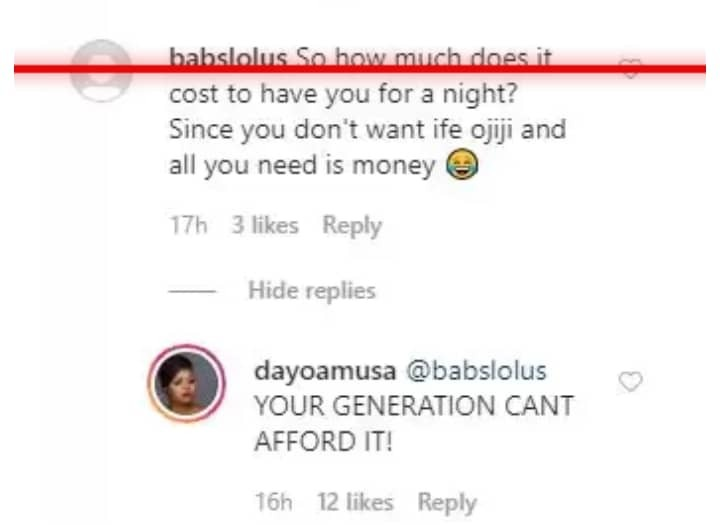 A fan or should I say a potential customer ready to offer her money took the opportunity to ask her how much it will cost to have her since “all she needs now is money”. Angered by the comment, Dayo revealed that it will cost him his generation to have her.