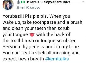 The self-proclaimed investigative journalist took to her Twitter page to admonish Yorubas to scrub their tongues when brushing their teeth, which she says is better than using a chewing stick.