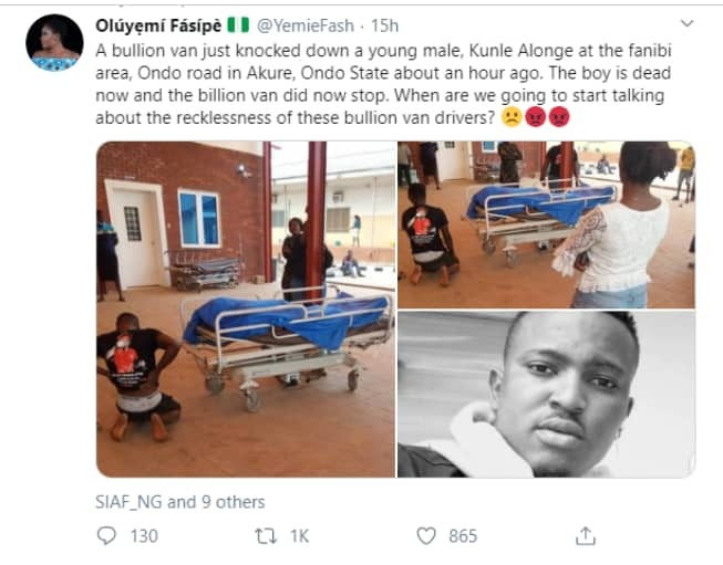 @YemieFash wrote: “A bullion van just knocked down a young male, Kunle Alonge at the fanibi area, Ondo road in Akure, Ondo State about an hour ago. The boy is dead now and the billion van did now stop. When are we going to start talking about the recklessness of these bullion van drivers?”