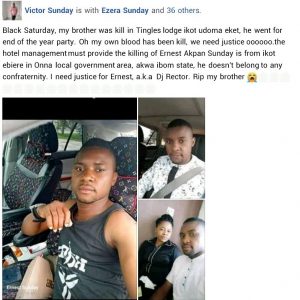 According to reports, Ernest was at Tingles lodge, Ikot Udoma in Eket for an End of Year party alongside his friends on Friday night, December 17.He was found dead in the swimming pool in the early hours of Saturday, December 18, with reports claiming that he had drowned.